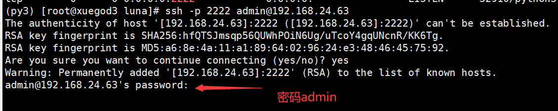 (py3) [root@xuegod3 luna]# ssh -p 2222 admin@192.168.24.63