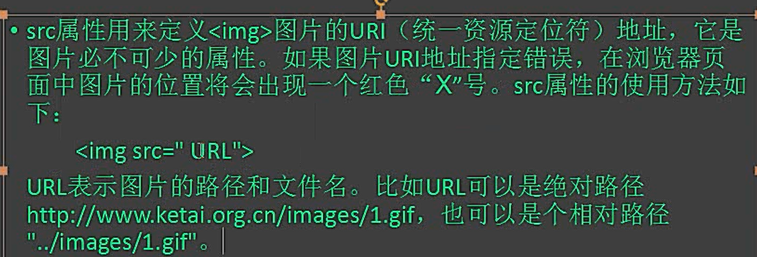 <src > 属性用来定义<img>图片的URL 地址,它是图片必不可少的属属性,如果图片URI地址指定错误,在浏览器页面图片的位置就会出现一个红色“x” 号,SRC属性的使用方法如下