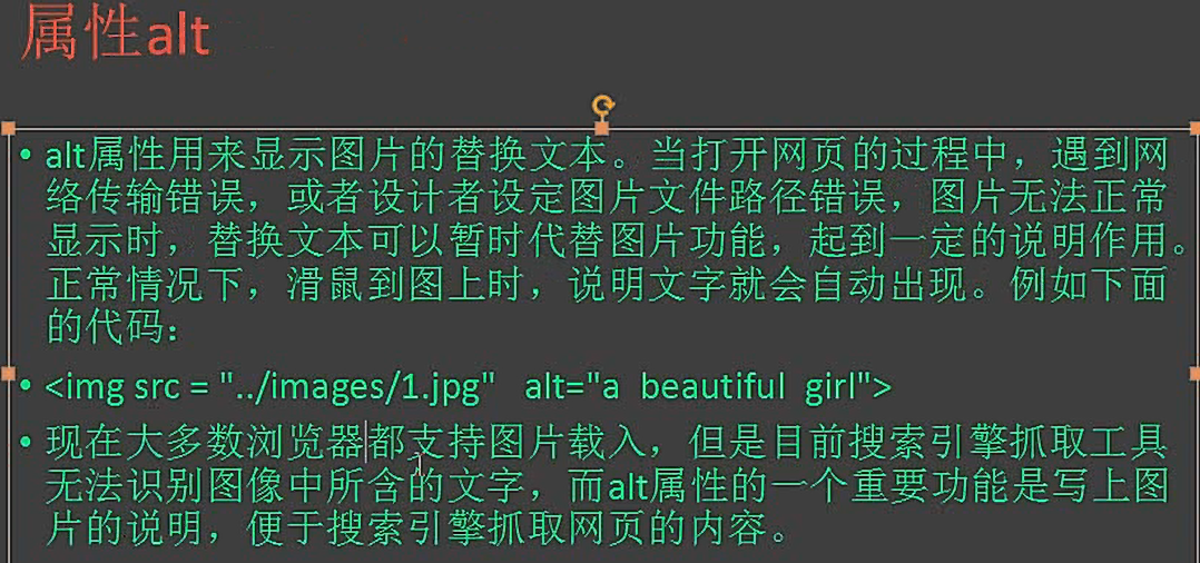 alt 属性用来显示图片的替换文本,当打开网页的过程中,遇到网络传输错误,或者设计者设定图片文件路径错误,图片无法