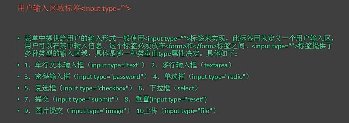 1 单=文本输入框 (input type="text") 2 多行输入框 textarea 3密码输入框 (input type="password") 4 单选项 (input type ="radio")