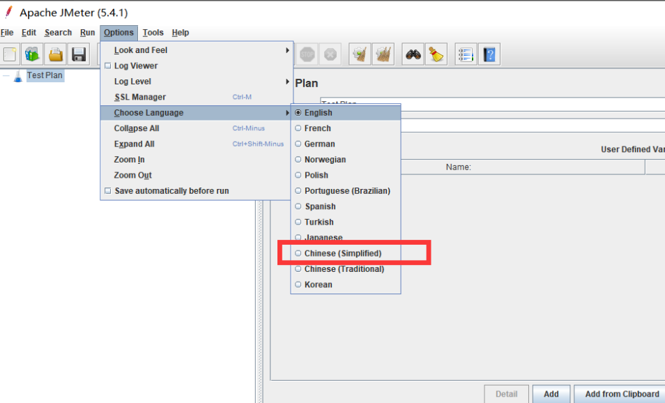 1.在jmeter里面直接改(Options --> Choose Language --> Chinese (Simplified))