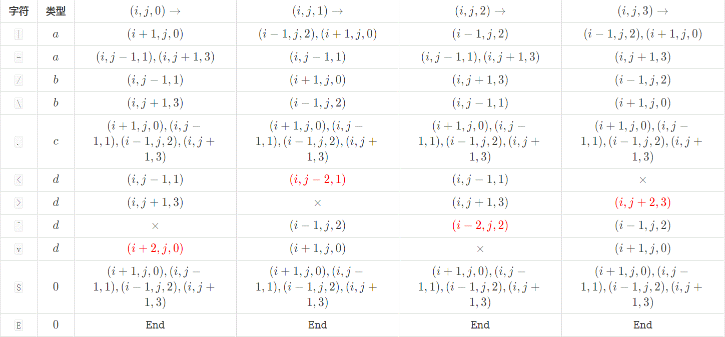 \[(i,j,0)\text{表示到达点}(i,j)\text{,}\color{red}{\text{来向}}~\color{black}{\text{是 北 方向}}\\(i,j,1)\text{表示到达点}(i,j)\text{,}\color{red}{\text{来向}}~\text{是 东 方向}\\(i,j,2)\text{表示到达点}(i,j)\text{,}\color{red}{\text{来向}}~\text{是 南 方向}\\(i,j,3)\text{表示到达点}(i,j)\text{,}\color{red}{\text{来向}}~\text{是 西 方向}