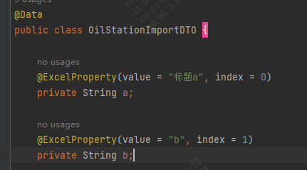 1.监听器: @Slf4j public class CustomAnalysisEventListener<T> extends AnalysisEventListener<T> { private int headRowNum; public CustomAnalysisEventListener(int headRowNum) { this.headRowNum = headRowNum; } private List<T> list = new ArrayList<>(); private List<CellExtra> cellExtraList = new ArrayList<>(); @Override public void invoke(T excelData, AnalysisContext analysisContext) { // log.info(" data -> {}", excelData); list.add(excelData); } @Override public void extra(CellExtra extra, AnalysisContext context) { CellExtraTypeEnum type = extra.getType(); switch (type) { case MERGE: { if (extra.getRowIndex() >= headRowNum) { cellExtraList.add(extra); } break; } default:{ } } } @Override public void doAfterAllAnalysed(AnalysisContext analysisContext) { } public List<T> getList() { return list; } public List<CellExtra> getCellExtraList() { return cellExtraList; } } 2. @Slf4j public class ExcelListener extends AnalysisEventListener { /** * 可以通过实例获取该值 */ private List<Object> dataList = new ArrayList<>(); @Override public void invoke(Object object, AnalysisContext context) { //数据存储到list,供批量处理,或后续自己业务逻辑处理。 dataList.add(object); handleBusinessLogic(); /* //如数据过大,可以进行定量分批处理 if(dataList.size()>=200){ handleBusinessLogic(); dataList.clear(); } */ } @Override public void doAfterAllAnalysed(AnalysisContext context) { //非必要语句,查看导入的数据 log.info("导入的数据条数为: " + dataList.size()); } /** * 根据业务自行实现该方法,例如将解析好的dataList存储到数据库中 */ private void handleBusinessLogic() { // TODO } public List<Object> getDataList() { return dataList; } public void setDataList(List<Object> dataList) { this.dataList = dataList; } } 3. @Slf4j @Component public class ExcelRead { private static final int HEAD_ROW_NUM = 1; public static <T> List<T> list(MultipartFile file, Class<T> tClass) throws IOException { List<T> excelDataList; CustomAnalysisEventListener listener = new CustomAnalysisEventListener(HEAD_ROW_NUM); EasyExcel.read(file.getInputStream(), tClass, listener).extraRead(CellExtraTypeEnum.MERGE).sheet().doRead(); excelDataList = listener.getList(); List<CellExtra> cellExtraList = listener.getCellExtraList(); if (cellExtraList != null && cellExtraList.size() > 0) { mergeExcelData(excelDataList, cellExtraList, HEAD_ROW_NUM); } return excelDataList; } private static <T> void mergeExcelData(List<T> excelDataList, List<CellExtra> cellExtraList, int headRowNum) { cellExtraList.forEach(cellExtra -> { int firstRowIndex = cellExtra.getFirstRowIndex() - headRowNum; int lastRowIndex = cellExtra.getLastRowIndex() - headRowNum; int firstColumnIndex = cellExtra.getFirstColumnIndex(); int lastColumnIndex = cellExtra.getLastColumnIndex(); //获取初始值 Object initValue = getInitValueFromList(firstRowIndex, firstColumnIndex, excelDataList); //设置值 for (int i = firstRowIndex; i <= lastRowIndex; i++) { for (int j = firstColumnIndex; j <= lastColumnIndex; j++) { setInitValueToList(initValue, i, j, excelDataList); } } }); } private static <T> void setInitValueToList(Object filedValue, Integer rowIndex, Integer columnIndex, List<T> data) { Object object = data.get(rowIndex); for (Field field : object.getClass().getDeclaredFields()) { field.setAccessible(true); ExcelProperty annotation = field.getAnnotation(ExcelProperty.class); if (annotation != null) { if (annotation.index() == columnIndex) { try { field.set(object, filedValue); break; } catch (IllegalAccessException e) { log.error("设置合并单元格的值异常:{}", e.getMessage()); } } } } } private static <T> Object getInitValueFromList(Integer firstRowIndex, Integer firstColumnIndex, List<T> data) { Object filedValue = null; Object object = data.get(firstRowIndex); for (Field field : object.getClass().getDeclaredFields()) { field.setAccessible(true); ExcelProperty annotation = field.getAnnotation(ExcelProperty.class); if (annotation != null) { if (annotation.index() == firstColumnIndex) { try { filedValue = field.get(object); break; } catch (IllegalAccessException e) { log.error("设置合并单元格的初始值异常:{}", e.getMessage()); } } } } return filedValue; } } 4.调用示例 list = ExcelRead.list(file, OilStationImportDTO.class);