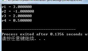 { float x,y; float r1,r2,r3,r4; x=1; y=2; r1=x+y; r2=x-y; r3=x*y; r4=x/y; printf("r1 = %f\n",r1); printf("r2 = %f\n",r2); printf("r3 = %f\n",r3); printf("r4 = %f\n",r4); return 0; }