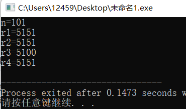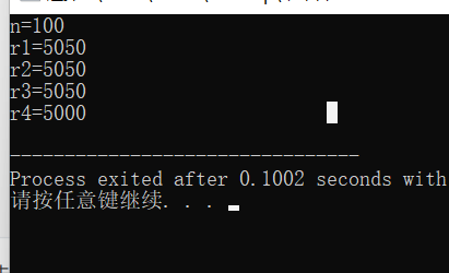 #include<stdio.h> int main() { int n=101,r1,r2,r3,r4; r1=n*(n+1)/2; r2=(n+1)*n/2; r3=n/2*(n+1); r4=(n+1)/2*n; printf("n=%d\n",n); printf("r1=%d\n",r1); printf("r2=%d\n",r2); printf("r3=%d\n",r3); printf("r4=%d\n",r4); return 0; }