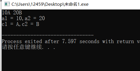 #include<stdio.h> int main() { int a1,a2; char c1,c2; scanf("%d%c%d%c",&a1,&c1,&a2,&c2); printf("a1 = %d,a2 = %d\n",a1,a2); printf("c1 = %c,c2 = %c\n",c1,c2); return 0; }