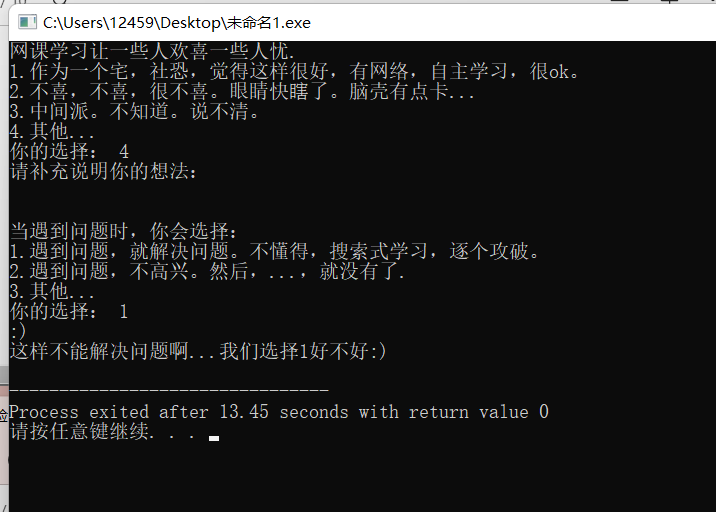 #include<stdio.h> int main() { int answer; char words[5000]; printf("网课学习让一些人欢喜一些人忧.\n"); printf("1.作为一个宅,社恐,觉得这样很好,有网络,自主学习,很ok。\n"); printf("2.不喜,不喜,很不喜。眼睛快瞎了。脑壳有点卡...\n"); printf("3.中间派。不知道。说不清。\n"); printf("4.其他...\n"); printf("你的选择: "); scanf("%d",&answer); if(answer == 4) { printf("请补充说明你的想法:\n"); getchar(); gets(words); } printf("\n"); printf("当遇到问题时,你会选择:\n"); printf("1.遇到问题,就解决问题。不懂得,搜索式学习,逐个攻破。\n"); printf("2.遇到问题,不高兴。然后,...,就没有了.\n"); printf("3.其他...\n"); printf("你的选择: "); scanf("%d",&answer); if(answer == 1) printf(":)\n"); else if(answer == 2); printf("这样不能解决问题啊...我们选择1好不好:)\n"); if(answer == 3) { printf("请补充说明你的想法:\n"); getchar(); gets(words); } return 0; }