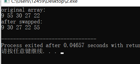 #include <stdio.h> #define N 5 void output(int x[], int n); int main() { int x[N] = {9, 55, 30, 27, 22}; int i; int t; printf("original array:\n"); output(x, N); for(i=0; i<N-1; ++i) if(x[i] > x[i+1]) { t = x[i]; x[i] = x[i+1]; x[i+1] = t; } printf("after swapped:\n"); output(x, N); return 0; } void output(int x[], int n) { int i; for(i=0; i<n; ++i) printf("%d ", x[i]); printf("\n"); }