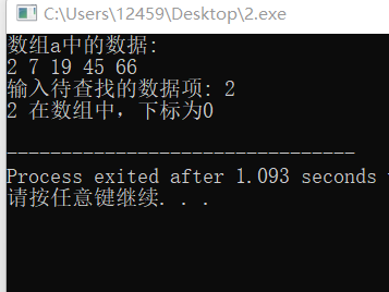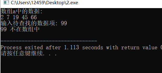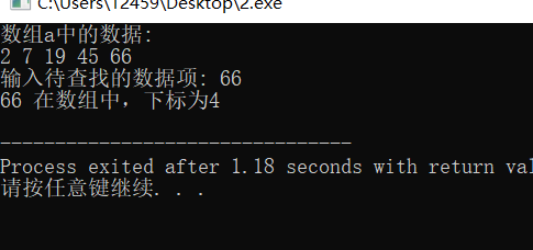 #include <stdio.h> #define N 5 int binarySearch(int x[], int n, int item); int main() { int a[N] = {2, 7, 19, 45, 66}; int i, index, key; printf("数组a中的数据:\n"); for (i = 0; i < N; i++) printf("%d ", a[i]); printf("\n"); printf("输入待查找的数据项: "); scanf("%d", &key); index=binarySearch(a,N,key); if (index >= 0) printf("%d 在数组中,下标为%d\n", key, index); else printf("%d 不在数组中\n", key); return 0; } int binarySearch(int x[], int n, int item) { int low, high, mid; low = 0; high = n - 1; while (low <= high) { mid = (low + high) / 2; if (x[mid]==item) return mid; else if (x[mid]>item) high = mid - 1; else low = mid + 1; } return -1; }