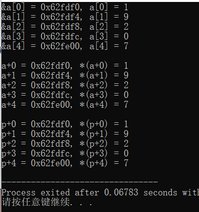 #include <stdio.h> #define N 5 int main() { int a[N] = {1, 9, 2, 0, 7}; int i; int *p; for(i=0; i<N; ++i) printf("&a[%d] = %#x, a[%d] = %d\n", i, &a[i], i, a[i]); printf("\n"); for(i=0; i<N; ++i) printf("a+%d = %#x, *(a+%d) = %d\n", i, a+i, i, *(a+i)); printf("\n"); p = a; for(i=0; i<N; ++i) printf("p+%d = %#x, *(p+%d) = %d\n", i, p+i, i, *(p+i)); return 0; }