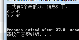#include <stdio.h> #define N 5 // 定义结构体类型struct student,并定义STU为其别名 typedef struct student { long no; char name[20]; int score; } STU; // 函数声明 void input(STU s[], int n); int findMinlist(STU s[], STU t[], int n); void output(STU s[], int n); int main() { STU stu[N], minlist[N]; int count; printf("录入%d个学生信息\n", N); input(stu, N); printf("\n统计最低分人数和学生信息...\n"); count = findMinlist(stu, minlist, N); printf("\n一共有%d个最低分,信息如下:\n", count); output(minlist, count); return 0; } // 输入n个学生信息,存放在结构体数组s中 void input(STU s[], int n) { int i; for (i = 0; i < n; i++) scanf("%ld %s %d", &s[i].no, s[i].name, &s[i].score); } // 输出结构体s中n个元素信息 void output(STU s[], int n) { int i; for (i = 0; i < n; i++) printf("%ld %s %d\n", s[i].no, s[i].name, s[i].score); } // 在结构体数组s中,查找最低分学生的记录,将其存入结构体数组t中 // 形参n是结构体数组s中元素个数 // 函数返回最低分的学生人数 int findMinlist(STU s[], STU t[], int n) { int min,i,j=0; min=s[0].score; for(i=0;i<n;i++) if(s[i].score<=min) min=s[i].score; for(i=0;i<n;i++) if(min==s[i].score) t[j++]=s[i]; return j; }