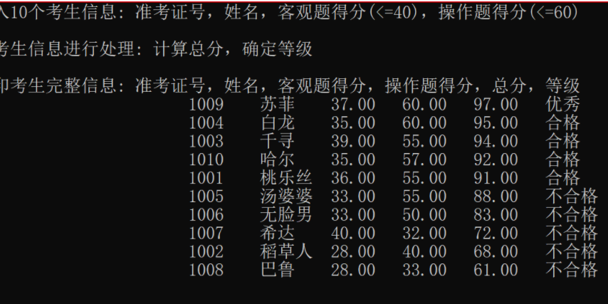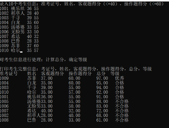 #include <stdio.h> #include <string.h> #define N 10 typedef struct student { long int id; char name[20]; float objective; float subjective; float sum; char level[10]; } STU; void input(STU s[], int n); void output(STU s[], int n); void process(STU s[], int n); int main() { STU stu[N]; printf("录入%d个考生信息: 准考证号,姓名,客观题得分(<=40),操作题得分(<=60)\n", N); input(stu, N); printf("\n对考生信息进行处理: 计算总分,确定等级\n"); process(stu, N); printf("\n打印考生完整信息: 准考证号,姓名,客观题得分,操作题得分,总分,等级\n"); output(stu, N); return 0; } void input(STU s[], int n) { FILE* find; int i; find=fopen("examinee.txt","r"); for (i = 0; i < n; i++) fscanf(find,"%ld %s %f %f", &s[i].id, s[i].name, &s[i].objective,&s[i].subjective); fclose(find); } void output(STU s[], int n) { FILE* out; int i; out=fopen("result.txt","w"); printf("准考证号 姓名 客观题得分 操作题得分 总分 等级\n"); fprintf(out,"准考证号 姓名 客观题得分 操作题得分 总分 等级\n"); for (i = 0; i < n; i++) { fprintf(out,"%-12ld%-6s%-12.2f%-12.2f%-8.2f%s\n", s[i].id, s[i].name, s[i].objective,s[i].subjective,s[i].sum,s[i].level); printf("%-12ld%-6s%-12.2f%-12.2f%-8.2f%s\n", s[i].id, s[i].name, s[i].objective,s[i].subjective,s[i].sum,s[i].level); } fclose(out); } void process(STU s[], int n) { int i,j; STU t; for(i=0;i<n;i++) s[i].sum=s[i].objective+s[i].subjective; for(i=0;i<n-1;i++) { t=s[i]; for(j=i+1;j<n;j++) { if(s[i].sum<s[j].sum) { t=s[j]; s[j]=s[i]; s[i]=t; } } } for(i=0;i<n;i++) { if((i+1)<=n/10) strcpy(s[i].level,"优秀"); else if((i+1)>n/10&&(i+1)<=n/2) strcpy(s[i].level,"合格"); else strcpy(s[i].level,"不合格"); } }