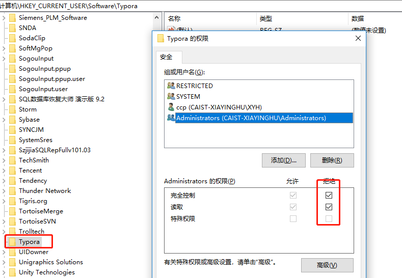 1、下载 Typora 0.11.18 最后一个免费版,已保存在百度网盘中,安装后修改注册表,打开regedit,找到计算机\HKEY_CURRENT_USER\Software\Typora,右键Typora,选择“权限”,将所有用户的权限勾选为拒绝,确认后便可免费试用,如下所示: