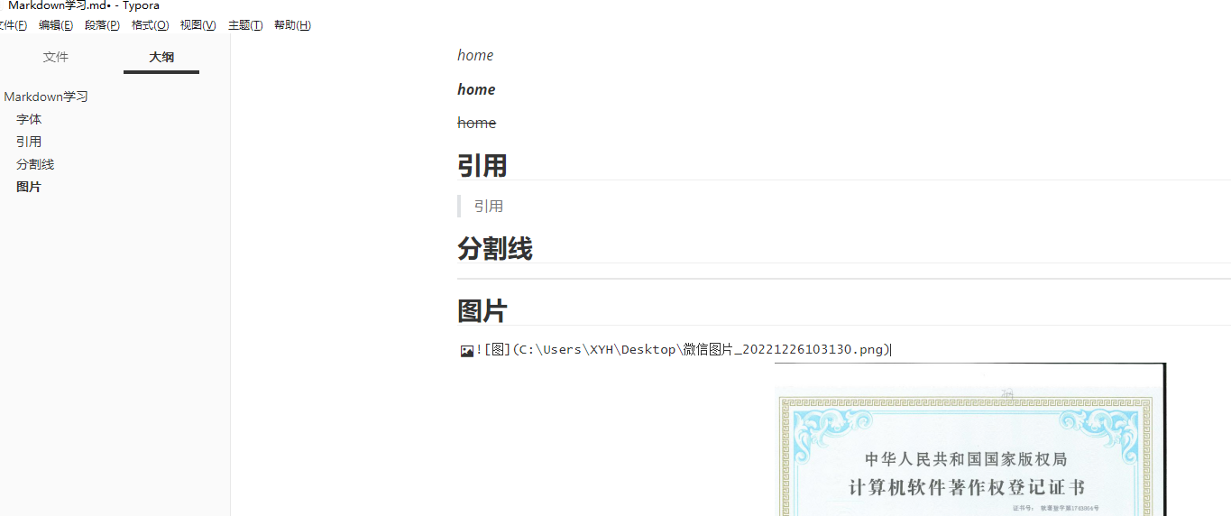 2、语法:# 一级标题(#后面空一格,然后输入标题内容),## 二级标题(##后面空一格,然后输入标题内容),### 三级标题(###后面空一格,然后输入标题内容),**粗体**(**中间加文字**,就会是粗体),*斜体*(*中间加文字,就会使斜体),***斜体加粗***(***中间加文字,就会使斜体加粗),~~文字中间划横线~~(~~中间加文字,就会使文字中间划线),>引用文字(>后面加文字,就会是引用效果),---或***(---或***可以显示一条分割线),![]()(表示插入图片,中括号里面写图片名称,小括号里面放图片地址,输入小括号时自动弹出浏览本地图片,如下所示)