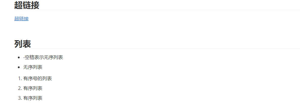 []()(中括号里写超链接名称,小括号里面写超链接地址),- (-号后面空一格,出现无序号列表),1. (1.空一格,会出现有序号的列表),