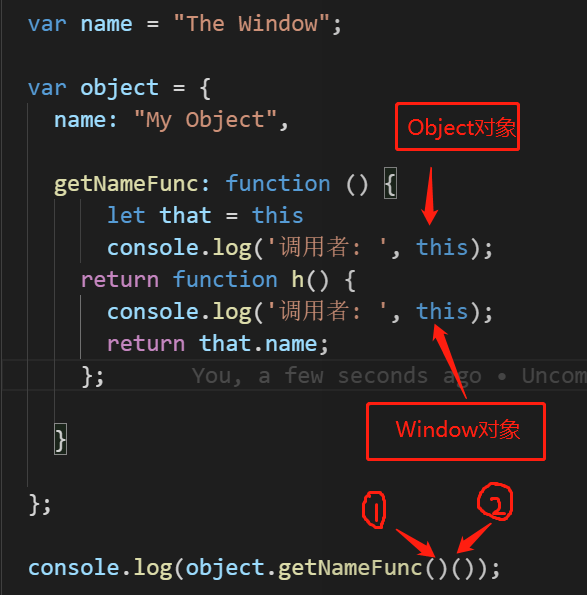 第一个this是谁使用他的的呢?就是object对象,它执行了getNameFunc函数,因为加了个()。