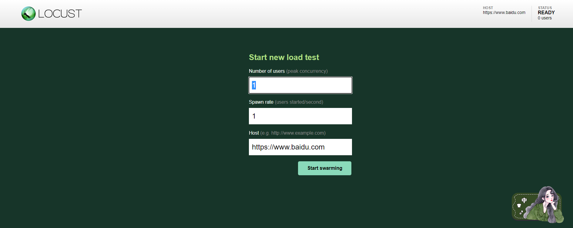 PS:8089是该服务启动的端口号,如果是本地启动,可以直接在浏览器输入http://localhost:8089打开UI界面,如果是其他机器搭建locust服务,则输入该机器的IP+端口即可;