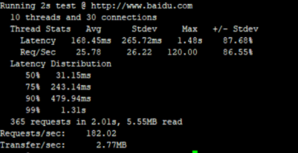 wrk -t10 -c30 -d 2s -T5s --latency http://www.baidu.com