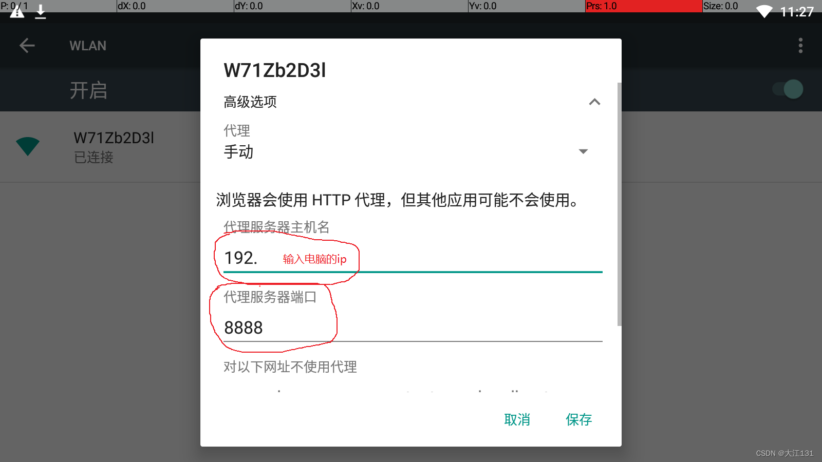 打开“设置” → 无线和网络 → WLAN → 点击“连接的wifi”3秒 → 打开“修改网络” → 在“代理服务器”中输入“查看的电脑IP” → 在“代理服务器端口”中输入“8888” → 保存