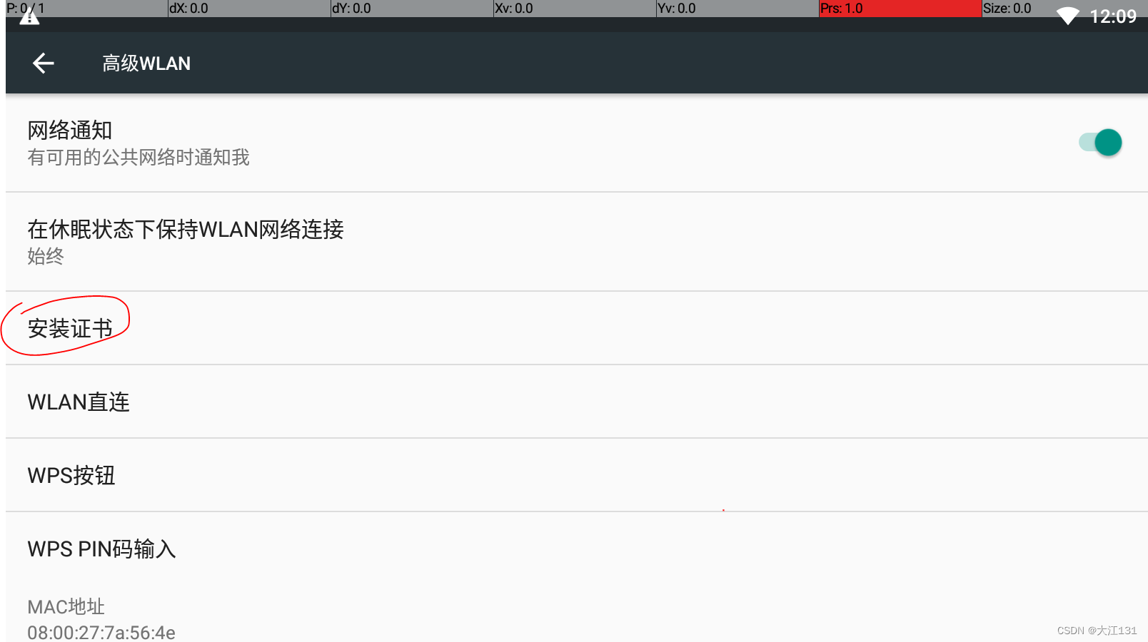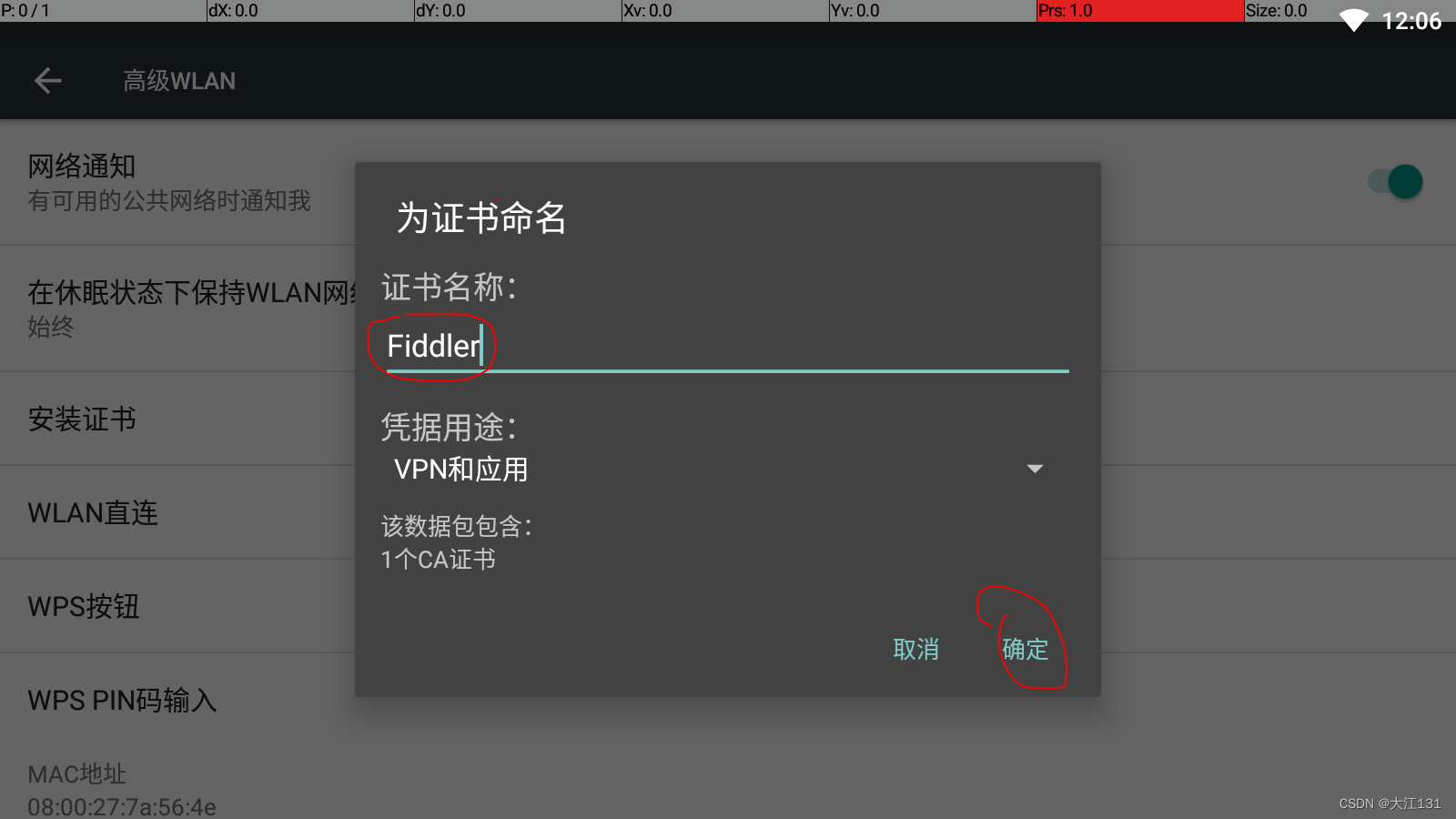 WLAN→右上角“3个点”→高级→安装证书→FiddlerRoot.crt→输入证书名称“Fiddler”→确定