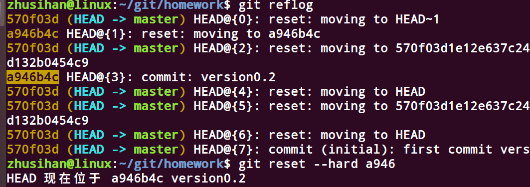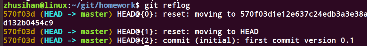 1 git reflog #可以查看当前HEAD之后的提交记录,便于回到未来