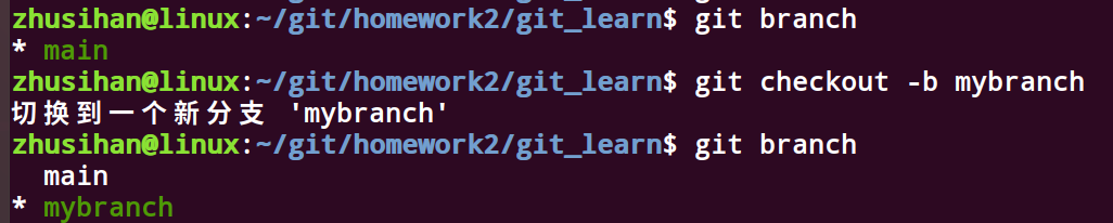 通过git branch 我们可以看到此时本地只有一个main分支,之后通过git checkout -b mybranch可以创建一个叫mybranch的分支,并且切换至该分支。再通过git branch 我们可以看到此时已经有两个分支并切换。