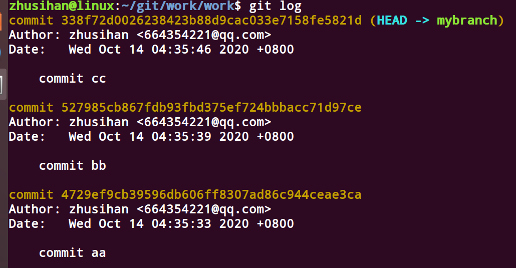 此时,我们再checkout一个分支做对比,在该分支上,我们提交了 aa,bb,cc