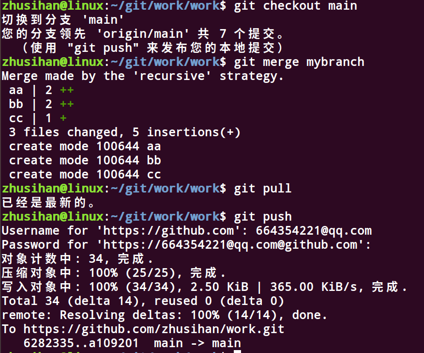 之后切换分支,合并mybranch,然后执行git pull与远程版本库保持同步,最后再git push推送即可。