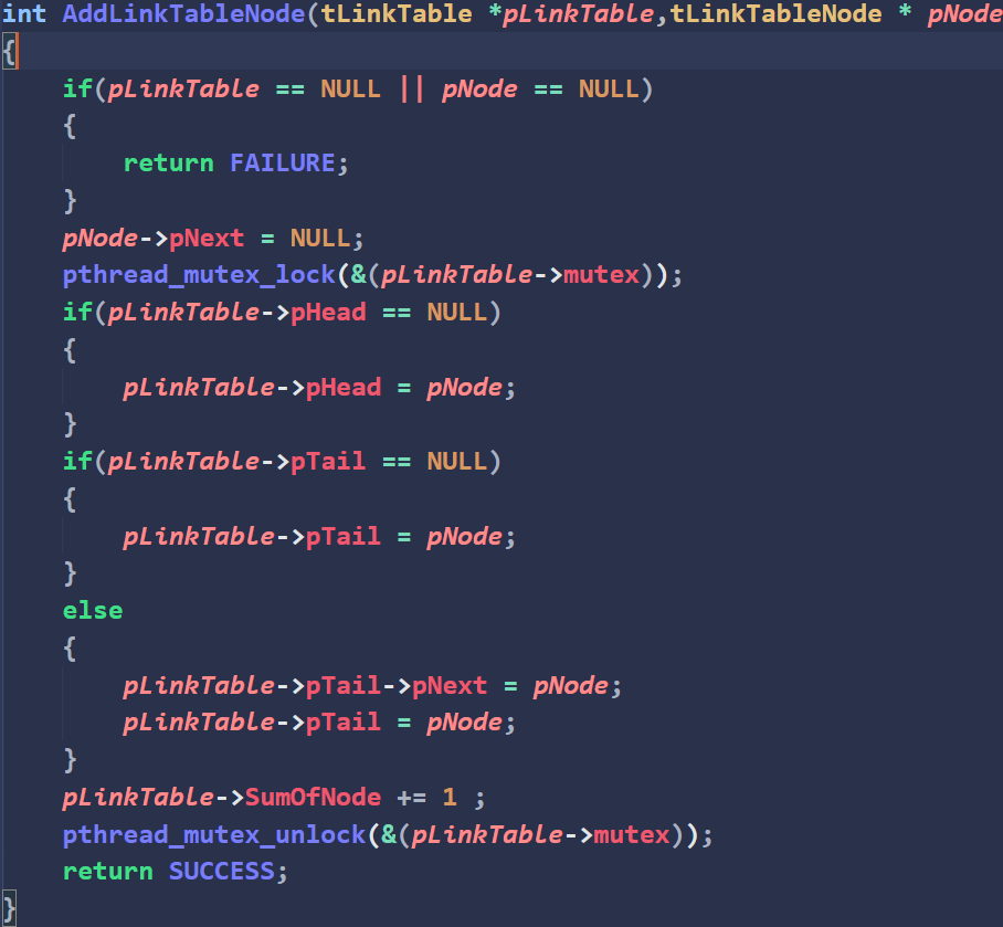 在DeleteLinkTable函数中,当要删除节点时,先用函数pthread_mutex_lock()进行上锁,进入临界区,等到删除完成后,使用pthread_mutex_unlock()释放锁,以实现线程安全。在彻底删除链表之前使用pthread_mutex_destroy销毁互斥锁mutex。