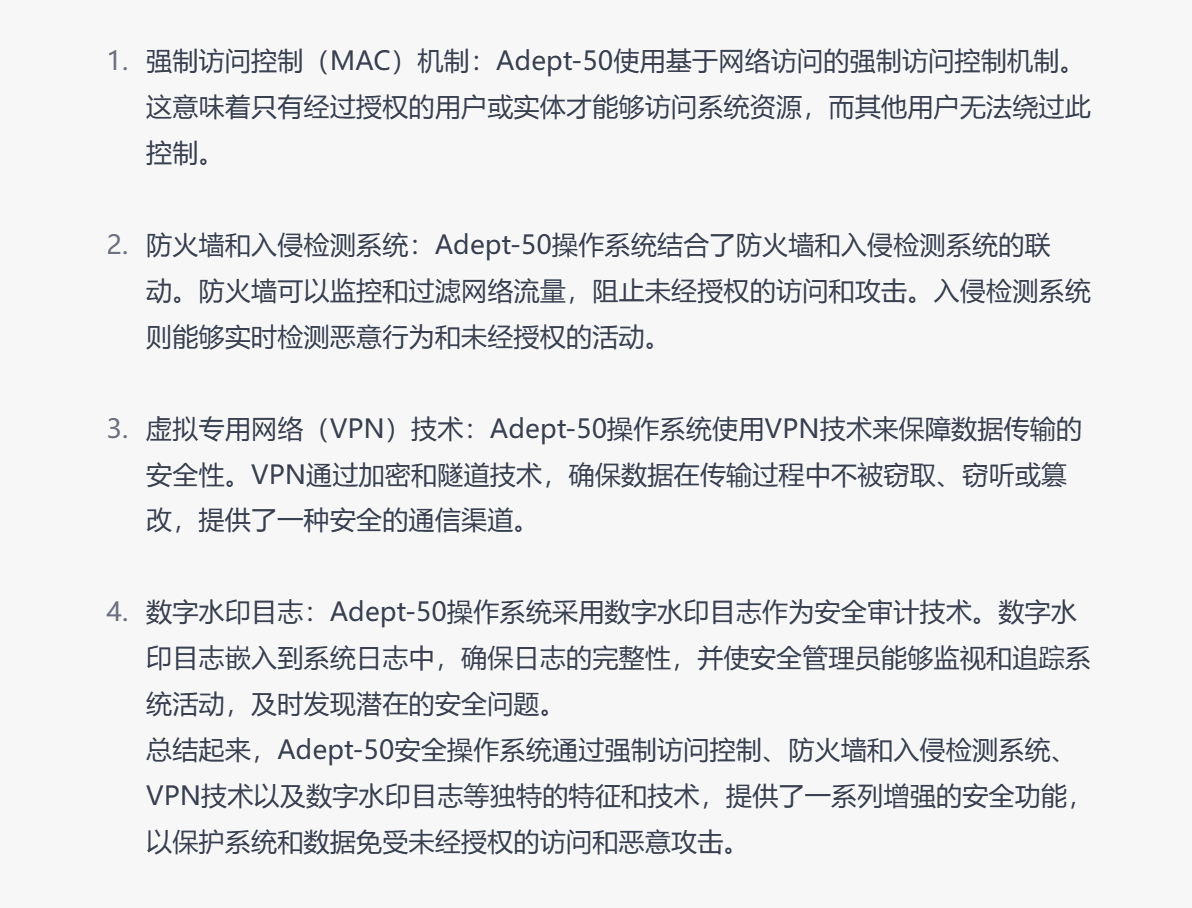 安全性增强的需求:随着计算机的广泛应用,数据的重要性也日益增加。在多用户环境下,计算机系统需要保护用户的数据和程序免受未经授权的访问、修改或破坏。Adept-50的出现为计算机系统提供了更多的安全措施和功能,如身份验证、访问控制列表等,增强了系统的安全性。