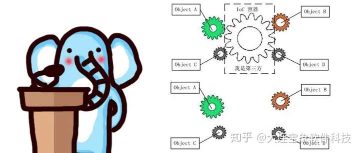 由于引进了中间位置的“第三方”,也就是IOC容器,使得A、B、C、D这4个对象没有了耦合关系,齿轮之间的传动全部依靠“第三方”了,全部对象的控制权全部上缴给“第三方”IOC容器,所以,IOC容器成了整个系统的关键核心,它起到了一种类似“粘合剂”的作用,把系统中的所有对象粘合在一起发挥作用,如果没有这个“粘合剂”,对象与对象之间会彼此失去联系,这就是有人把IOC容器比喻成“粘合剂”的由来。