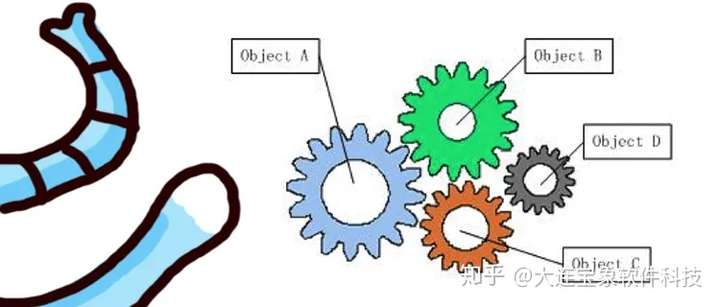 如果我们打开机械式手表的后盖,就会看到与上面类似的情形,各个齿轮分别带动时针、分针和秒针顺时针旋转,从而在表盘上产生正确的时间。图中描述的就是这样的一个齿轮组,它拥有多个独立的齿轮,这些齿轮相互啮合在一起,协同工作,共同完成某项任务。我们可以看到,在这样的齿轮组中,如果有一个齿轮出了问题,就可能会影响到整个齿轮组的正常运转。齿轮组中齿轮之间的啮合关系,与软件系统中对象之间的耦合关系非常相似。