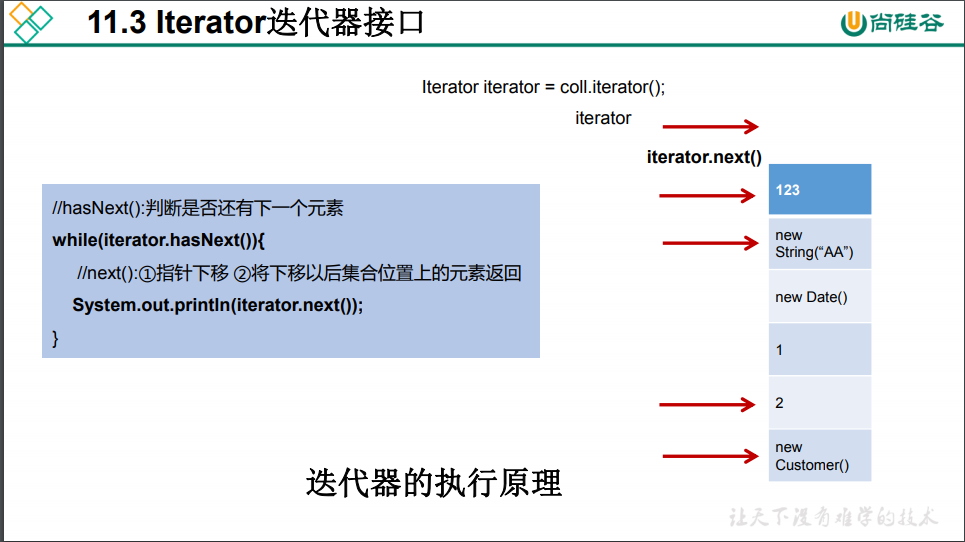 package com.atguigu.java; import org.junit.Test; import java.util.ArrayList; import java.util.Collection; import java.util.Iterator; /** * 集合元素的遍历操作,使用迭代器Iterator接口 * 1.内部的方法:hasNext() 和 next() * 2.集合对象每次调用iterator()方法都得到一个全新的迭代器对象, * 默认游标都在集合的第一个元素之前。 * 3.内部定义了remove(),可以在遍历的时候,删除集合中的元素。此方法不同于集合直接调用remove() * * @author shkstart * @create 2019 上午 10:44 */ public class IteratorTest { @Test public void test1(){ Collection coll = new ArrayList(); coll.add(123); coll.add(456); coll.add(new Person("Jerry",20)); coll.add(new String("Tom")); coll.add(false); Iterator iterator = coll.iterator(); //方式一: // System.out.println(iterator.next()); // System.out.println(iterator.next()); // System.out.println(iterator.next()); // System.out.println(iterator.next()); // System.out.println(iterator.next()); // //报异常:NoSuchElementException // System.out.println(iterator.next()); //方式二:不推荐 // for(int i = 0;i < coll.size();i++){ // System.out.println(iterator.next()); // } //方式三:推荐 ////hasNext():判断是否还有下一个元素 while(iterator.hasNext()){ //next():①指针下移 ②将下移以后集合位置上的元素返回 System.out.println(iterator.next()); } } @Test public void test2(){ Collection coll = new ArrayList(); coll.add(123); coll.add(456); coll.add(new Person("Jerry",20)); coll.add(new String("Tom")); coll.add(false); //错误方式一: // Iterator iterator = coll.iterator(); // while((iterator.next()) != null){ // System.out.println(iterator.next()); // } //错误方式二: //集合对象每次调用iterator()方法都得到一个全新的迭代器对象,默认游标都在集合的第一个元素之前。 while (coll.iterator().hasNext()){ System.out.println(coll.iterator().next()); } } //测试Iterator中的remove() //如果还未调用next()或在上一次调用 next 方法之后已经调用了 remove 方法, // 再调用remove都会报IllegalStateException。 @Test public void test3(){ Collection coll = new ArrayList(); coll.add(123); coll.add(456); coll.add(new Person("Jerry",20)); coll.add(new String("Tom")); coll.add(false); //删除集合中"Tom" Iterator iterator = coll.iterator(); while (iterator.hasNext()){ // iterator.remove(); Object obj = iterator.next(); if("Tom".equals(obj)){ iterator.remove(); // iterator.remove(); } } //遍历集合 iterator = coll.iterator(); while (iterator.hasNext()){ System.out.println(iterator.next()); } } }