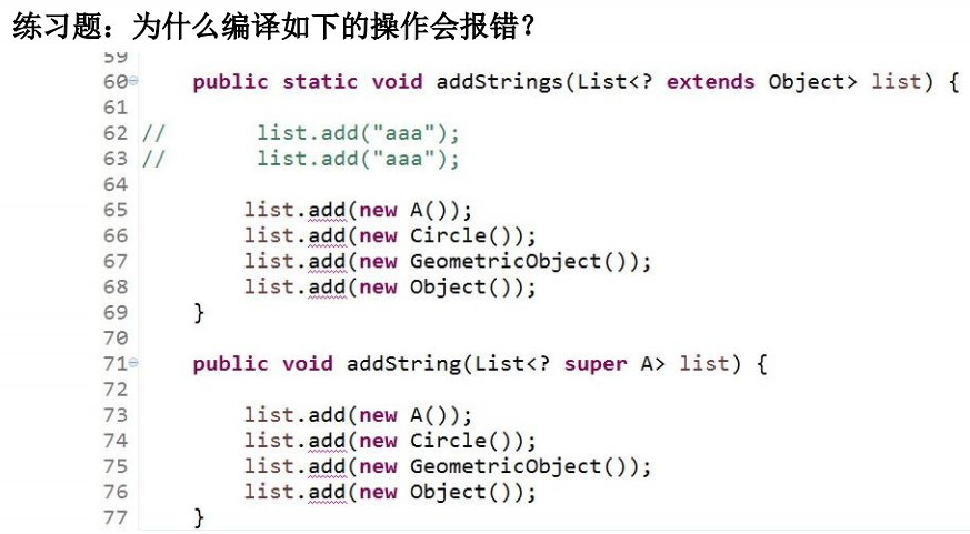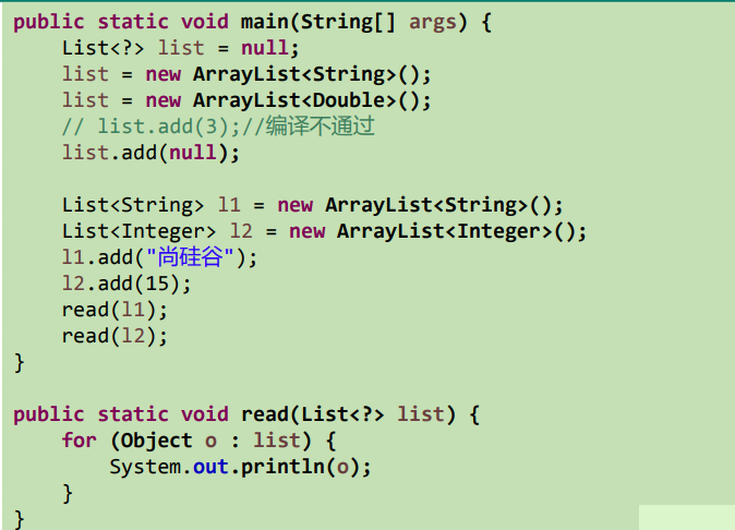 package com.atguigu.java2; import org.junit.Test; import java.util.AbstractList; import java.util.ArrayList; import java.util.Iterator; import java.util.List; /** * * 1. 泛型在继承方面的体现 * * * 2. 通配符的使用 * * @author shkstart * @create 2019 下午 2:13 */ public class GenericTest { /* 1. 泛型在继承方面的体现 虽然类A是类B的父类,但是G<A> 和G<B>二者不具备子父类关系,二者是并列关系。 补充:类A是类B的父类,A<G> 是 B<G> 的父类 */ @Test public void test1(){ Object obj = null; String str = null; obj = str; Object[] arr1 = null; String[] arr2 = null; arr1 = arr2; //编译不通过 // Date date = new Date(); // str = date; List<Object> list1 = null; List<String> list2 = new ArrayList<String>(); //此时的list1和list2的类型不具有子父类关系 //编译不通过 // list1 = list2; /* 反证法: 假设list1 = list2; list1.add(123);导致混入非String的数据。出错。 */ show(list1); show1(list2); } public void show1(List<String> list){ } public void show(List<Object> list){ } @Test public void test2(){ AbstractList<String> list1 = null; List<String> list2 = null; ArrayList<String> list3 = null; list1 = list3; list2 = list3; List<String> list4 = new ArrayList<>(); } /* 2. 通配符的使用 通配符:? 类A是类B的父类,G<A>和G<B>是没有关系的,二者共同的父类是:G<?> */ @Test public void test3(){ List<Object> list1 = null; List<String> list2 = null; List<?> list = null; list = list1; list = list2; //编译通过 // print(list1); // print(list2); // List<String> list3 = new ArrayList<>(); list3.add("AA"); list3.add("BB"); list3.add("CC"); list = list3; //添加(写入):对于List<?>就不能向其内部添加数据。 //除了添加null之外。 // list.add("DD"); // list.add('?'); list.add(null); //获取(读取):允许读取数据,读取的数据类型为Object。 Object o = list.get(0); System.out.println(o); } public void print(List<?> list){ Iterator<?> iterator = list.iterator(); while(iterator.hasNext()){ Object obj = iterator.next(); System.out.println(obj); } } /* 3.有限制条件的通配符的使用。 ? extends A: G<? extends A> 可以作为G<A>和G<B>的父类,其中B是A的子类 ? super A: G<? super A> 可以作为G<A>和G<B>的父类,其中B是A的父类 */ @Test public void test4(){ List<? extends Person> list1 = null; List<? super Person> list2 = null; List<Student> list3 = new ArrayList<Student>(); List<Person> list4 = new ArrayList<Person>(); List<Object> list5 = new ArrayList<Object>(); list1 = list3; list1 = list4; // list1 = list5; // list2 = list3; list2 = list4; list2 = list5; //读取数据: list1 = list3; Person p = list1.get(0); //编译不通过 //Student s = list1.get(0); list2 = list4; Object obj = list2.get(0); ////编译不通过 // Person obj = list2.get(0); //写入数据: //编译不通过 // list1.add(new Student()); //编译通过 list2.add(new Person()); list2.add(new Student()); } }