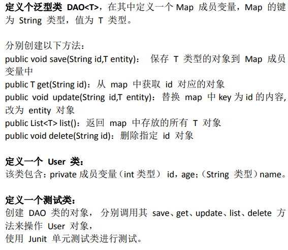 package com.atguigu.exer1; import java.util.*; /** * 定义个泛型类 DAO<T>,在其中定义一个Map 成员变量,Map 的键为 String 类型,值为 T 类型。 分别创建以下方法: public void save(String id,T entity): 保存 T 类型的对象到 Map 成员变量中 public T get(String id):从 map 中获取 id 对应的对象 public void update(String id,T entity):替换 map 中key为id的内容,改为 entity 对象 public List<T> list():返回 map 中存放的所有 T 对象 public void delete(String id):删除指定 id 对象 * * @author shkstart * @create 2019 下午 3:34 */ public class DAO<T> { private Map<String,T> map = new HashMap<String,T>(); //保存 T 类型的对象到 Map 成员变量中 public void save(String id,T entity){ map.put(id,entity); } //从 map 中获取 id 对应的对象 public T get(String id){ return map.get(id); } //替换 map 中key为id的内容,改为 entity 对象 public void update(String id,T entity){ if(map.containsKey(id)){ map.put(id,entity); } } //返回 map 中存放的所有 T 对象 public List<T> list(){ //错误的: // Collection<T> values = map.values(); // return (List<T>) values; //正确的: ArrayList<T> list = new ArrayList<>(); Collection<T> values = map.values(); for(T t : values){ list.add(t); } return list; } //删除指定 id 对象 public void delete(String id){ map.remove(id); } }