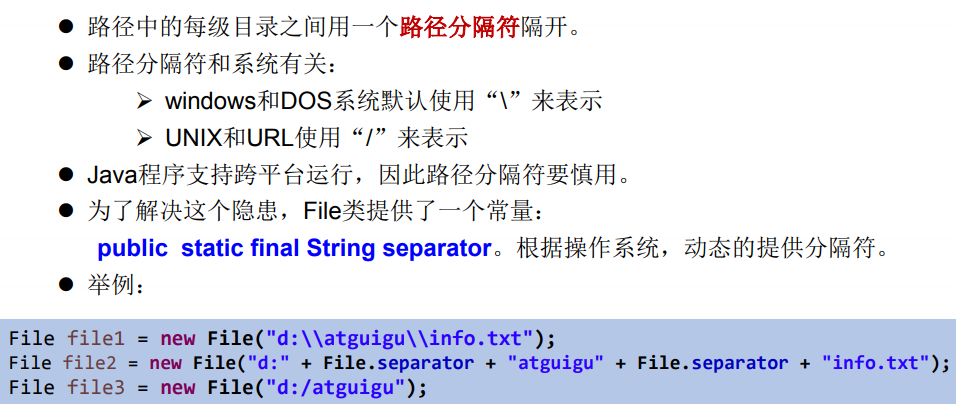 package com.atguigu.java3; import org.junit.Test; import java.io.File; import java.io.IOException; import java.util.Date; /** * File类的使用 * * 1. File类的一个对象,代表一个文件或一个文件目录(俗称:文件夹) * 2. File类声明在java.io包下 * 3. File类中涉及到关于文件或文件目录的创建、删除、重命名、修改时间、文件大小等方法, * 并未涉及到写入或读取文件内容的操作。如果需要读取或写入文件内容,必须使用IO流来完成。 * 4. 后续File类的对象常会作为参数传递到流的构造器中,指明读取或写入的"终点". * * * * * @author shkstart * @create 2019 下午 4:05 */ public class FileTest { /* 1.如何创建File类的实例 File(String filePath) File(String parentPath,String childPath) File(File parentFile,String childPath) 2. 相对路径:相较于某个路径下,指明的路径。 绝对路径:包含盘符在内的文件或文件目录的路径 3.路径分隔符 windows:\\ unix:/ */ @Test public void test1(){ //构造器1 File file1 = new File("hello.txt");//相对于当前module File file2 = new File("D:\\workspace_idea1\\JavaSenior\\day08\\he.txt"); System.out.println(file1); System.out.println(file2); //构造器2: File file3 = new File("D:\\workspace_idea1","JavaSenior"); System.out.println(file3); //构造器3: File file4 = new File(file3,"hi.txt"); System.out.println(file4); } /* public String getAbsolutePath():获取绝对路径 public String getPath() :获取路径 public String getName() :获取名称 public String getParent():获取上层文件目录路径。若无,返回null public long length() :获取文件长度(即:字节数)。不能获取目录的长度。 public long lastModified() :获取最后一次的修改时间,毫秒值 如下的两个方法适用于文件目录: public String[] list() :获取指定目录下的所有文件或者文件目录的名称数组 public File[] listFiles() :获取指定目录下的所有文件或者文件目录的File数组 */ @Test public void test2(){ File file1 = new File("hello.txt"); File file2 = new File("d:\\io\\hi.txt"); System.out.println(file1.getAbsolutePath()); System.out.println(file1.getPath()); System.out.println(file1.getName()); System.out.println(file1.getParent()); System.out.println(file1.length()); System.out.println(new Date(file1.lastModified())); System.out.println(); System.out.println(file2.getAbsolutePath()); System.out.println(file2.getPath()); System.out.println(file2.getName()); System.out.println(file2.getParent()); System.out.println(file2.length()); System.out.println(file2.lastModified()); } @Test public void test3(){ File file = new File("D:\\workspace_idea1\\JavaSenior"); String[] list = file.list(); for(String s : list){ System.out.println(s); } System.out.println(); File[] files = file.listFiles(); for(File f : files){ System.out.println(f); } } /* public boolean renameTo(File dest):把文件重命名为指定的文件路径 比如:file1.renameTo(file2)为例: 要想保证返回true,需要file1在硬盘中是存在的,且file2不能在硬盘中存在。 */ @Test public void test4(){ File file1 = new File("hello.txt"); File file2 = new File("D:\\io\\hi.txt"); boolean renameTo = file2.renameTo(file1); System.out.println(renameTo); } /* public boolean isDirectory():判断是否是文件目录 public boolean isFile() :判断是否是文件 public boolean exists() :判断是否存在 public boolean canRead() :判断是否可读 public boolean canWrite() :判断是否可写 public boolean isHidden() :判断是否隐藏 */ @Test public void test5(){ File file1 = new File("hello.txt"); file1 = new File("hello1.txt"); System.out.println(file1.isDirectory()); System.out.println(file1.isFile()); System.out.println(file1.exists()); System.out.println(file1.canRead()); System.out.println(file1.canWrite()); System.out.println(file1.isHidden()); System.out.println(); File file2 = new File("d:\\io"); file2 = new File("d:\\io1"); System.out.println(file2.isDirectory()); System.out.println(file2.isFile()); System.out.println(file2.exists()); System.out.println(file2.canRead()); System.out.println(file2.canWrite()); System.out.println(file2.isHidden()); } /* 创建硬盘中对应的文件或文件目录 public boolean createNewFile() :创建文件。若文件存在,则不创建,返回false public boolean mkdir() :创建文件目录。如果此文件目录存在,就不创建了。如果此文件目录的上层目录不存在,也不创建。 public boolean mkdirs() :创建文件目录。如果此文件目录存在,就不创建了。如果上层文件目录不存在,一并创建 删除磁盘中的文件或文件目录 public boolean delete():删除文件或者文件夹 删除注意事项:Java中的删除不走回收站。 */ @Test public void test6() throws IOException { File file1 = new File("hi.txt"); if(!file1.exists()){ //文件的创建 file1.createNewFile(); System.out.println("创建成功"); }else{//文件存在 file1.delete(); System.out.println("删除成功"); } } @Test public void test7(){ //文件目录的创建 File file1 = new File("d:\\io\\io1\\io3"); boolean mkdir = file1.mkdir(); if(mkdir){ System.out.println("创建成功1"); } File file2 = new File("d:\\io\\io1\\io4"); boolean mkdir1 = file2.mkdirs(); if(mkdir1){ System.out.println("创建成功2"); } //要想删除成功,io4文件目录下不能有子目录或文件 File file3 = new File("D:\\io\\io1\\io4"); file3 = new File("D:\\io\\io1"); System.out.println(file3.delete()); } }