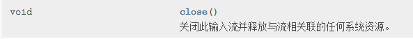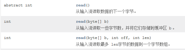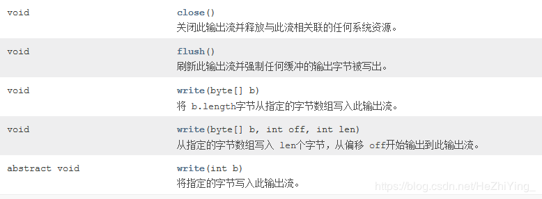 public class Main { public static void main(String[] args) { try { InputStream in = new FileInputStream("C:\\Users\\Administrator\\Desktop\\a.txt"); byte[] bytes = new byte[2]; //这里我写2是为了演示,一般写1024吧 int n; while ((n = in.read(bytes)) != -1) { String s = new String(bytes,0,n);//这个不能直接写bytes,不然可能会读错 System.out.println(s); } in.close(); } catch (IOException e) { e.printStackTrace(); } } } 运行结果: <ignore_js_op> 字节输出流 OutputStream:这个抽象类是表示字节输出流的所有类的超类,下面是他的方法 <ignore_js_op>![]()