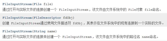 InputStream:这个抽象类是表示输入字节流的所有类的超类,这是它的部分方法 <ignore_js_op> <ignore_js_op> FileInputStream:是InputStream的子类,其构造方法如下 <ignore_js_op>