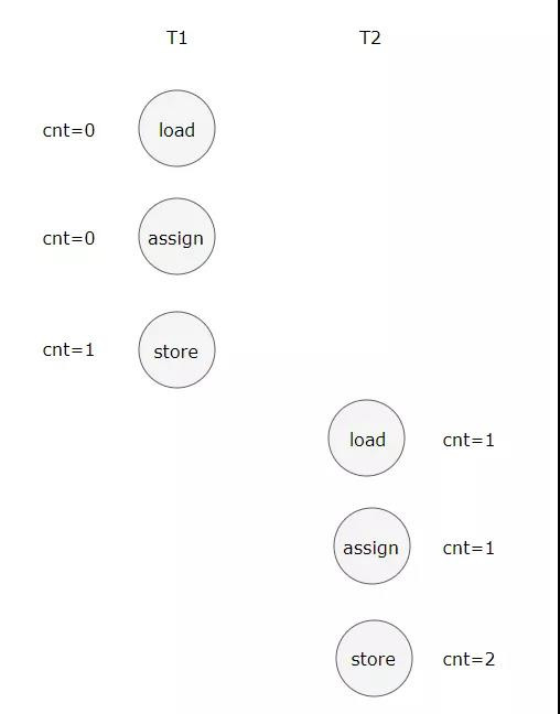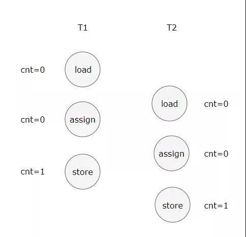 下图演示了两个线程同时对 cnt 进行操作,load、assign、store 这一系列操作整体上看不具备原子性,那么在 T1 修改 cnt 并且还没有将修改后的值写入主内存,T2 依然可以读入旧值。可以看出,这两个线程虽然执行了两次自增运算,但是主内存中 cnt 的值最后为 1 而不是 2。因此对 int 类型读写操作满足原子性只是说明 load、assign、store 这些单个操作具备原子性。