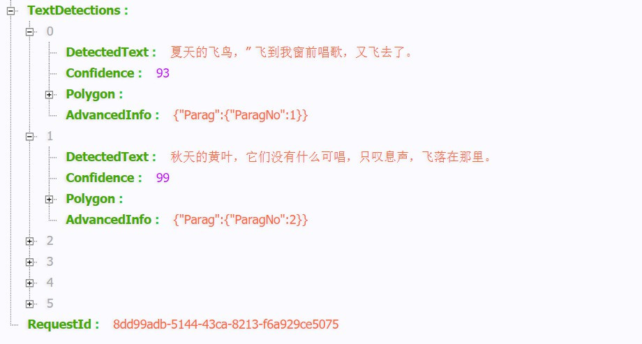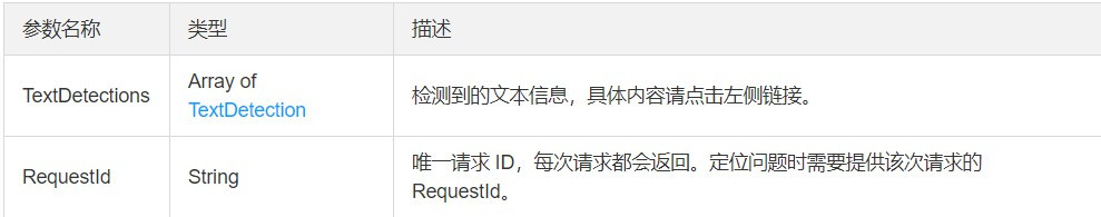 RequestId 主要就是当出现问题的时候用来定位问题需要的参数。至于TextDetections 看一下后面实例中的返回参数自然就懂了