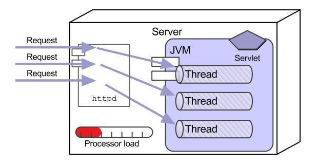 CGI的推出,使得web开发正式进入了动态处理时代,服务器能与客户有真正意义上的交流了,有能存储数据的数据库了,虽然CGI的使用周期并不长,但是一定要纪念一下它,毕竟它是里程碑式的变革。java web技术正是踩着CGI的肩膀来到了广大程序员的面前,java web解决了CGI的性能问题。CGI是以进程为单位管理请求的,而java web则是以线程为单位,处理能力更强,占用的资源更少,这个核心的组件就是Servlet。看一组资源占用图,先看CGI的: