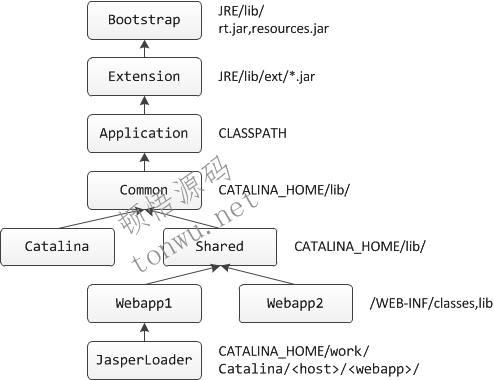 - JasperLoader - 父加载器是 Webapp 加载器,加载 work 目录应用编译 JSP 生成的 class 文件