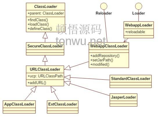在实现时,上图不是继承关系,而是通过组合体现父子关系。Tomcat 类加载器的源码类图: