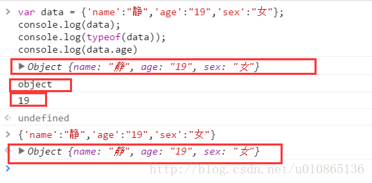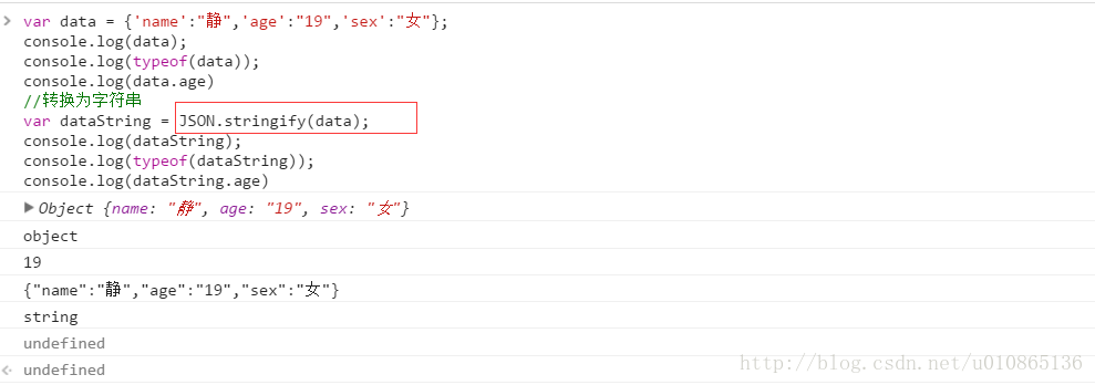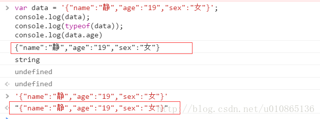 单独使用console控制台输出json字符串,结果”{“name”:”静”,”age”:”19”,”sex”:”女”}”;
