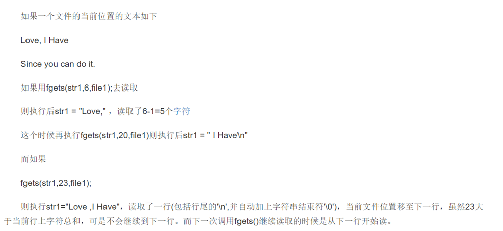 缓冲区总是以NULL字符结尾,对fgets的下一次调用会继续读该行。函数成功将返回的地址与传入的第一个参数相同,失败或读到文件结尾返回NULL。因此我们不能直接通过fgets的返回值来判断函数是否是出错而终止的,应该借助feof函数或者ferror函数来判断。