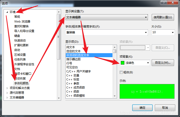 2、依次点击:环境、字体和颜色、文本编辑器、非活动的选定文本、项背景色