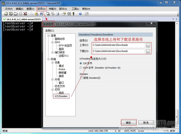 选择某个session(选项) 标签,点鼠标右键,弹出菜单,选择session option(会话选项),如下图,设置上传和下载目录