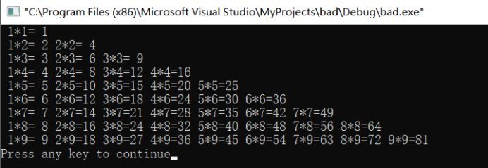printf("%2d*%d=%2d",j,i,i*j);