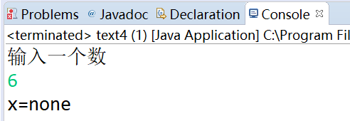 package 作业1; import java.util.Scanner; public class text4 { public static void main(String[] args) { // TODO Auto-generated method stub Scanner input=new Scanner(System.in); System.out.println("输入一个数"); int x=input.nextInt(); switch(x){ case 1: System.out.println("x=1"); break; case 5: System.out.println("x=5"); break; case 10: System.out.println("x=10"); break; default: System.out.println("x=none"); } } }