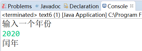 package 作业1; import java.util.Scanner; public class text6 { public static void main(String[] args) { // TODO Auto-generated method stub Scanner input=new Scanner(System.in); System.out.println("输入一个年份"); int a=input.nextInt(); if(a%4==0&&a%100!=8||a%400==0){ System.out.println("闰年"); }else{ System.out.println("不是闰年"); } } }